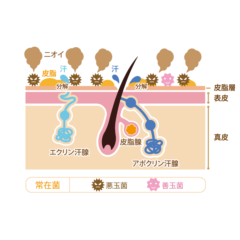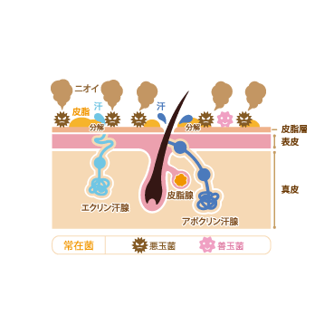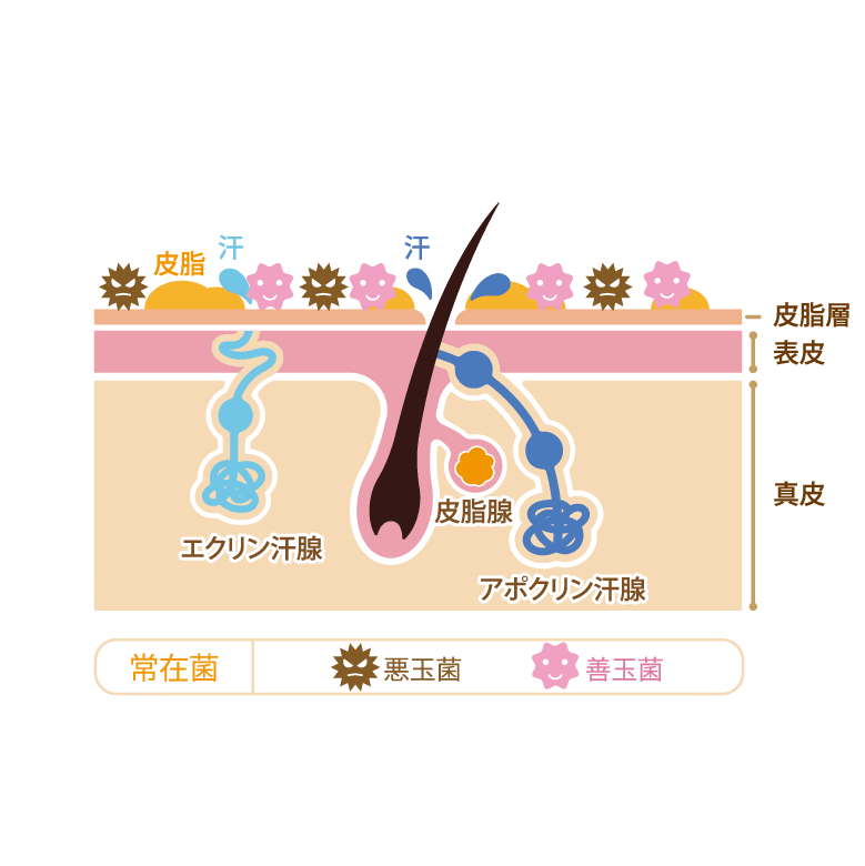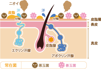 肌には常在菌が棲み、有用な善玉菌だけではなく、悪玉菌などの雑菌も存在。