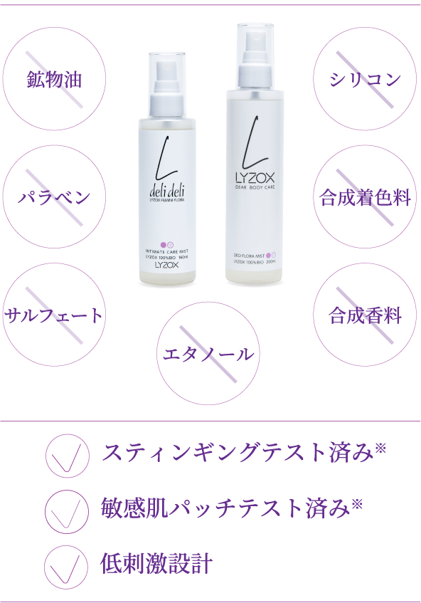 主要成分のリゾックスは、100%天然由来成分だから体にやさしく、またピリピリ・ひりひり感を評価するスティンギングテスト、敏感肌用パッチテスト実施済みの低刺激設計です。